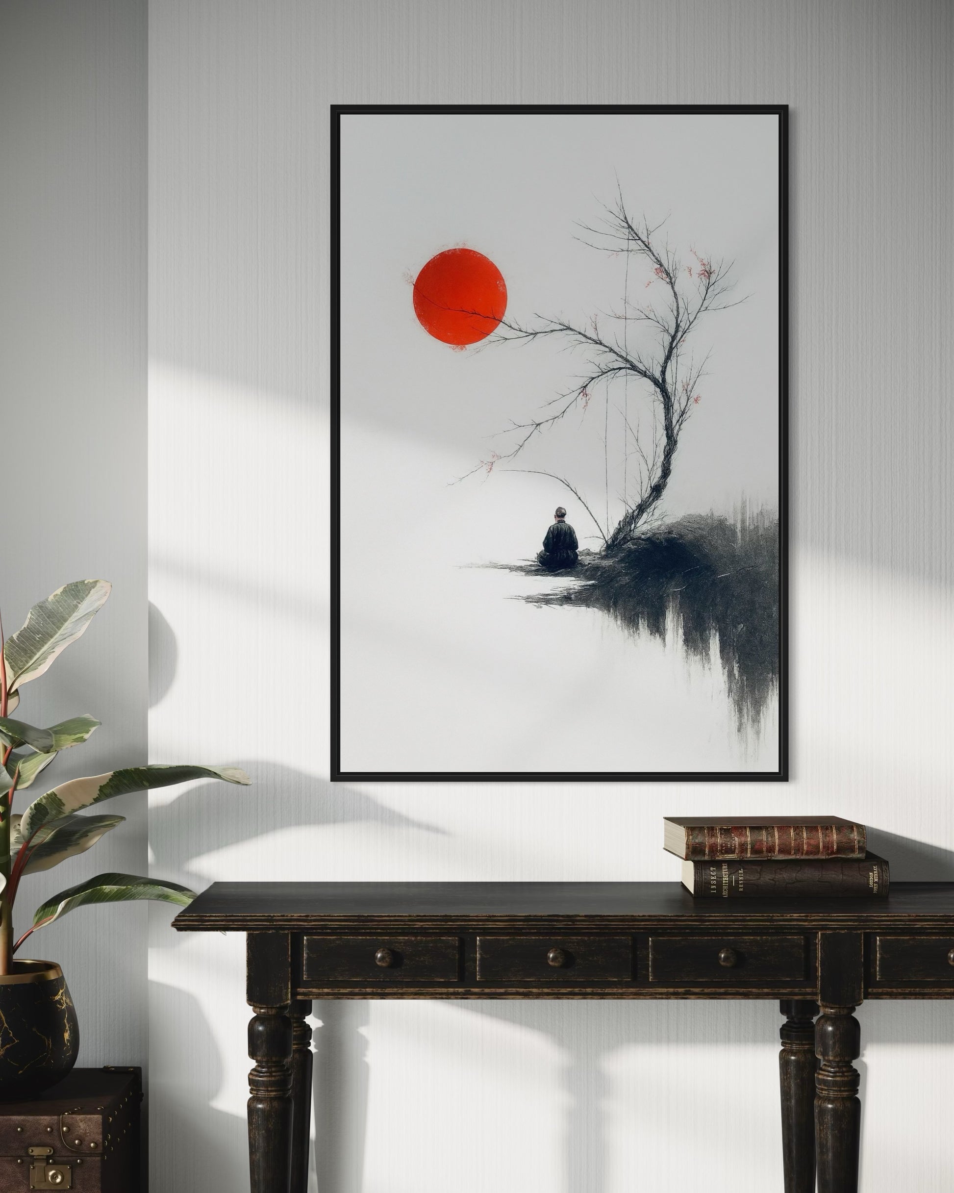 Bring calmness and balance into your space with this Zen-inspired minimalist wall art. Featuring a serene figure meditating under a leafless tree with a bold red sun, this Japanese ink-style artwork reflects mindfulness, simplicity, and harmony. Perfect for living rooms, bedrooms, meditation corners, yoga studios, or office spaces.